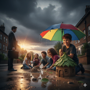 Suddenly, dark clouds gathered and rain began to fall. The clay houses started melting away. Most of the children only laughed and prepared to build again. But one boy quickly ran into his house, brought an umbrella, and placed it over the little clay house he had made. He wanted to protect it from the rain so that it would not be destroyed.
