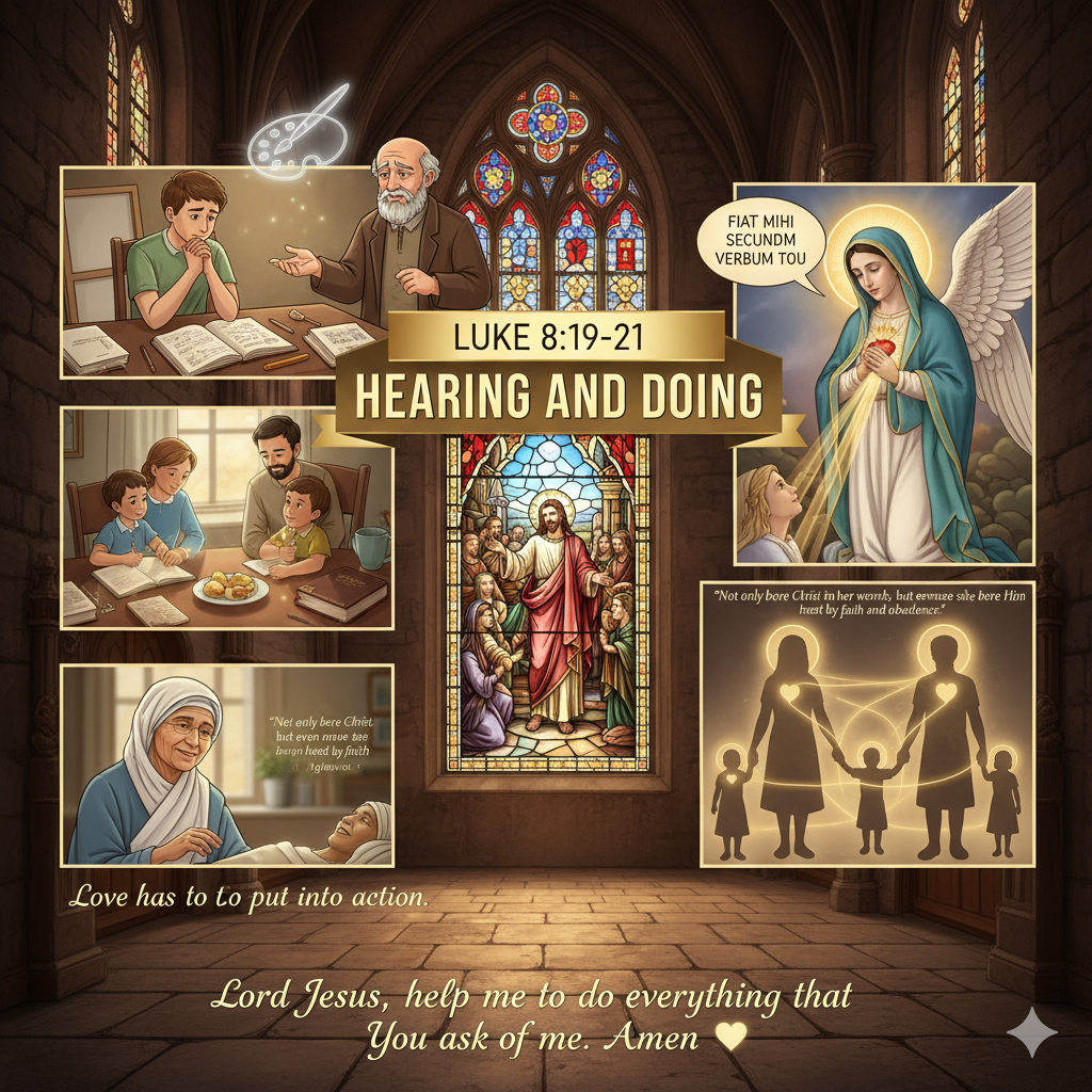A homily on Luke 8:19-21, reflecting on the word “do,” showing how Jesus honours His Mother for living God’s Word and inviting us to ...
