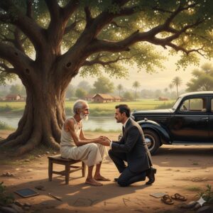 Years passed. The little ones grew up. They left the village and went to faraway places. No one came back to thank him. The teacher grew old, his voice weak, his eyesight dim. Still, every morning, he sat under the tamarind tree, waiting to see if some child would come to learn. One day, as he sat alone, a car stopped near him. A man stepped out in a fine suit and touched his feet. The old teacher looked up in surprise. “Do you remember me?” the man asked. “I was that boy who used to sit in the last row, the one who always forgot his slate.” The teacher’s eyes filled with tears. The man continued, “Sir, everything I am today began under this tree. You gave me the courage to dream.” The old man smiled through his tears and whispered, “Then God has repaid me.”